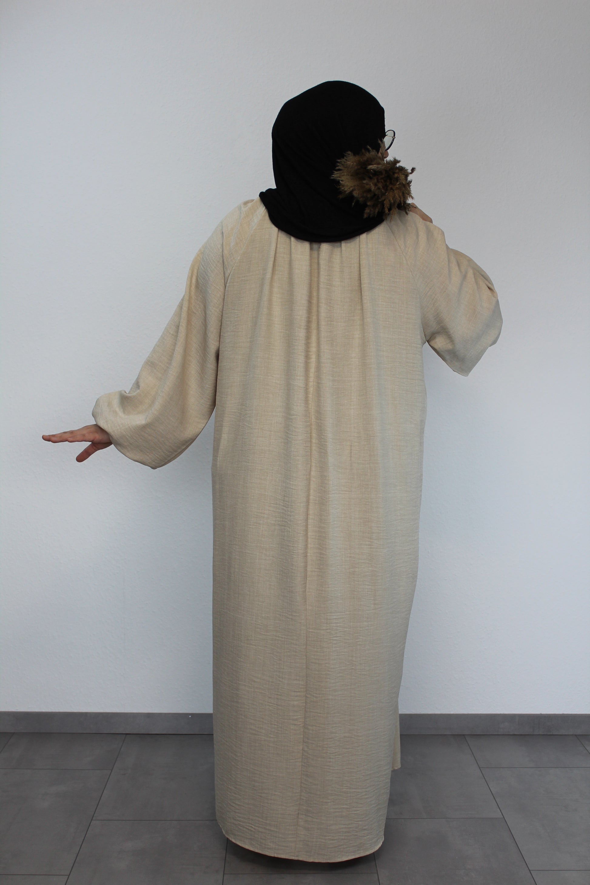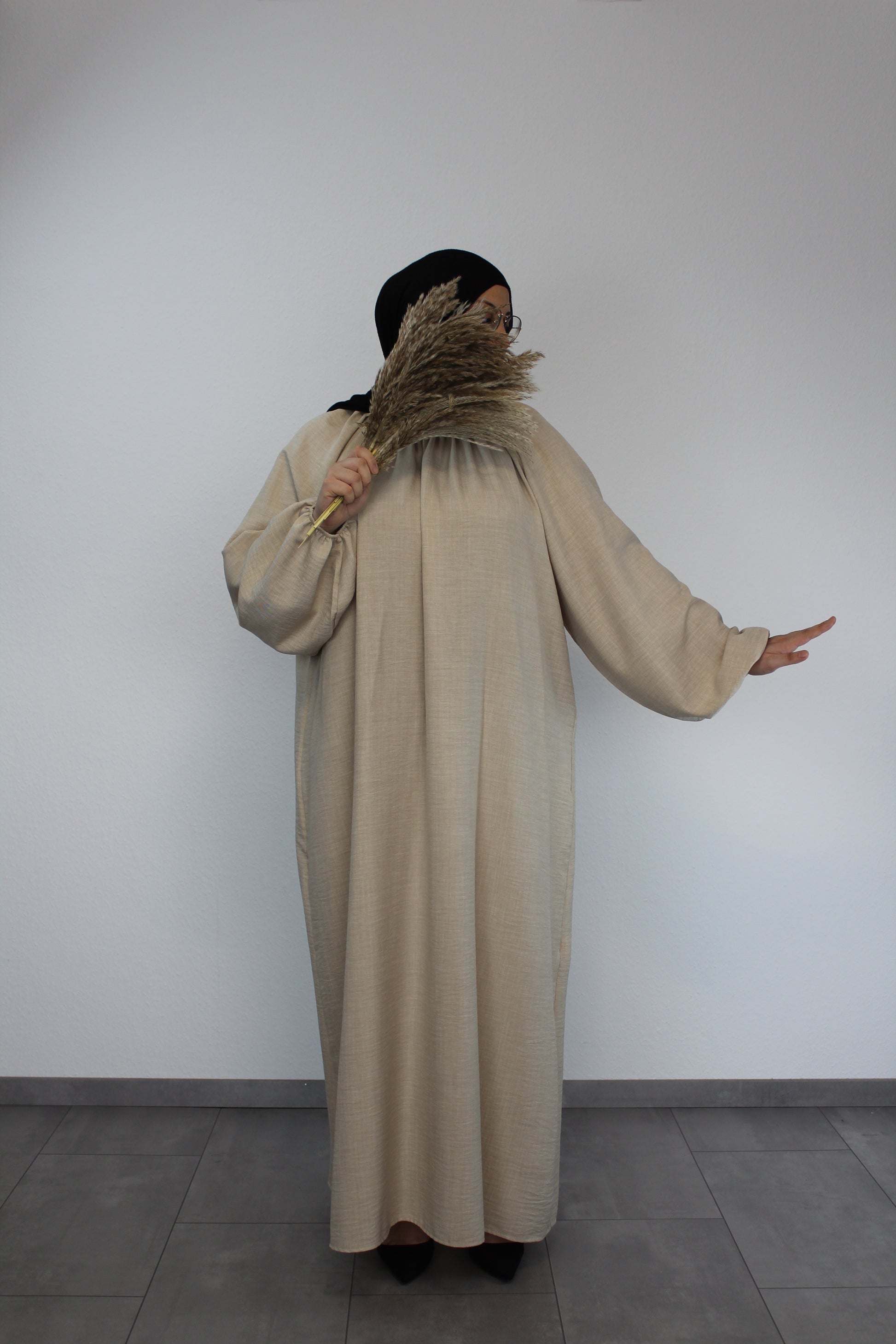 Die Abaya Rabiye überzeugt durch ihre sorgfältig abgestimmte Materialzusammensetzung aus 35 % Viskose, 60 % Polyester und 5 % Elasthan in Einheitsgröße. Dieses hochwertige Textil bietet eine ausgewogene Kombination aus Atmungsaktivität, Strapazierfähigkeit und elastischem Komfort, die für eine optimale Passform und angenehmes Tragegefühl sorgt. Ideal für den täglichen Gebrauch sowie besondere Anlässe, verbindet sie klassische Eleganz.